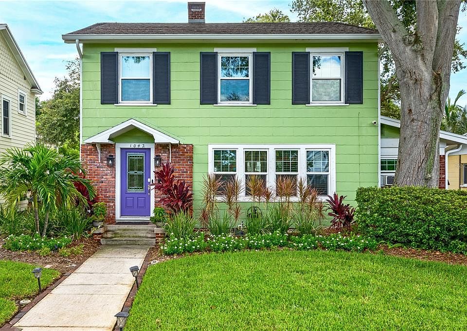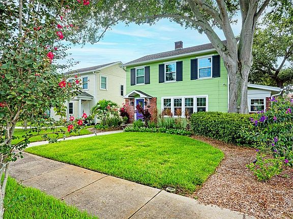 Welcome to the highly sought-after neighborhood of Euclid/St. Paul and this beautiful and fully-renovated Colonial-style home. This residence has been incredibly updated with virtually every modern convenience, while staying true to its original 1928 charm. Situated on the tree-shaded brick streets of this ever-popular area so close to downtown, this home was updated in the last six years in so many ways. From first sight of the vibrant violet-hued entry door and the beautiful garden landscaping, to the carefully-laid Augusta brick patios and walkways throughout the backyard, this home offers light and bright spaces and so many upgrades to weather our storm seasons. Classic hardwood floors of oak and heart of pine run throughout the home. The two story residence features two bedrooms and two baths upstairs, a half-bath downstairs and a bonus room for use as an office or flex space and an additional bonus office area attached to the garage. The living room is expansive, with a restored fireplace which has been converted to natural gas. Just off this space is a sun-filled flexible bonus room, ideal for a home office, workout room or playroom. The kitchen and dining area are spacious and surrounded by windows overlooking the backyard and outdoor dining area. The recently renovated kitchen is stunning, featuring all wood cabinetry, marble countertops, Samsung induction stove, Miele dishwasher, and wine cooler. Two large bedrooms and two fully renovated bathrooms are just up the staircase. The primary en-suite bathroom features custom built-in cabinetry, marble counters and tile and seamless glass shower. The inside laundry with stackable washer/dryer is just off the kitchen and leads to the classic and beautifully pavered Augusta brick and turf backyard. This area is perfect for entertaining, with alcoves for grilling, outdoor dining, play spaces, firepit area and more and all surrounded by beautiful custom wood and vinyl fencing for ultimate privacy. A detached two-car garage is just off the back steps, and features an additional 221 square feet of air conditioned space, perfect for a home office, work out room or flex space. Upgrades include newer roofs with double hurricane clips (2020) natural gas tankless hot water heater (2021), almost all windows replaced in 2021 with hurricane impact windows, the (4) lower front windows replaced and offer hurricane protective curtains, impact doors (2021), newer electrical throughout home (2021) newer electric panel (2024), all plumbing updated (2021), newer 24KW Generac full house generator (2023), newer gutters, newly installed French drains in backyard, well irrigation, new landscaping and lighting, Augusta brick walkways and patios and so much more. Absolutely move-in ready to immediately ENJOY! This picturesque property is located within an easy stroll to beautiful Crescent Lake Park, and is a 5-minute drive or quick bike ride to downtown St. Petersburg’s many restaurants, museums, theaters, shopping and entertainment. No flood insurance required. This beauty won’t last! Schedule your showing today!
