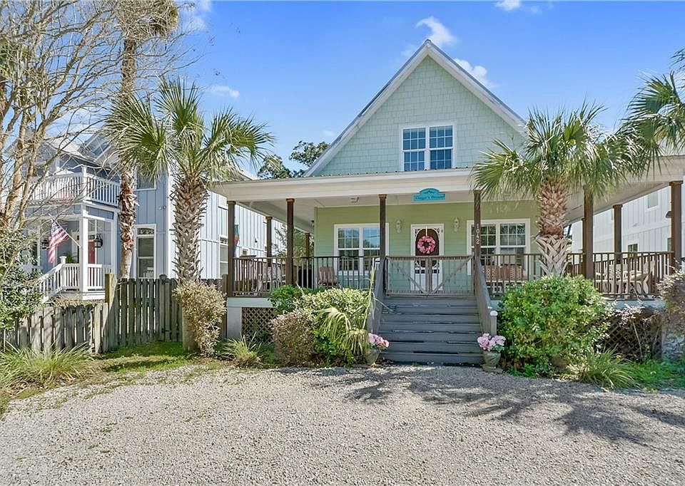If you are looking for an island getaway, this is the perfect 2 story beach cottage! A wrap around front porch greets you with plenty of space for chairs to enjoy the island air. With an open floorplan that includes a family room perfect for entertaining or relaxing after a day at the beach, kitchen with custom cabinets and granite countertops. The master suite is on the first floor and features a walk in closet, double vanities with a large walk-in shower in the bathroom. Upstairs are two large bedrooms on either side of the landing feature two closets each for lots of storage. Upstairs bathroom has a tub/shower and tile floors. Lots of storage in this house with two additional closets in the upstairs sitting area. Backyard is fenced for privacy and there is a storage shed for outdoor storage. Use this property as a vacation rental or make this your forever home on the island!