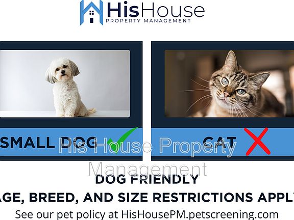 SMALL DOGS ONLY. Dogs under 35 lbs. Maximum of 2 pets. Age, breed, and size restrictions apply.