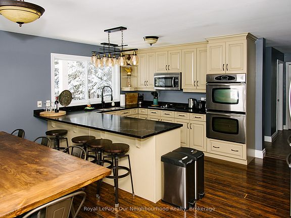 Welcome to 1042 Ski Ridge Trail.This 4 bedroom masterpiece offers convenient ski-in/ski-out access to Sir Sams Ski & Ride. Privately situated on 1.4 acres of pristine forest offering peace and tranquillity. The main floor consists of a stunning open concept kitchen/dining room combination and cozy living room along with 1 bedroom and 4-piece bath. 2nd floor consists of 3 additional bedrooms including primary bedroom and 3-piece bath. Fully finished basement offers additional living space, including recreation room, wet bar, games room and 3-piece bath. Basement walks out to beautiful patio and hot tub. Enjoy roaring fires out front and sip your favourite drink on the stunning covered custom stone wrap around porch. Enjoy relaxing evenings in the charming and spacious authentic wood burning outdoor sauna. Home is complete with multi-camera security system and EV fast charging station. Private, secondary driveway located on the back side of the property leading to endless possibilities. During the winter months, enjoy ski-in/ski-out access to the ski hill, double the fun with bike-in/bike-out access to the incredible bike trails during the rest of the year. There is never a dull moment here with Hiking, ATVing, snowmobiling and much more at your finger tips,, the possibilities are endless! 10 minute walk to a beautiful beach on Eagle Lake.
