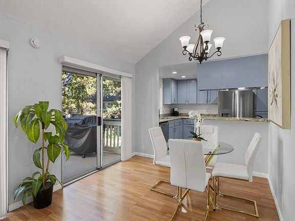 The open layout showcases vaulted ceilings and a cozy fireplace. A large sliding door opens to a spacious patio with extra storage. The primary bedroom features a vaulted ceiling, a walk-in closet. Additional perks include an in-unit laundry room with washer and dryer, central A/C and heating, and 2 private parking spaces (1 covered, 1 open).