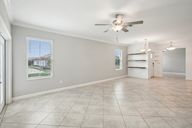 - Built-in Features, Ceiling Fan(s), Crown Molding, Eating Space In Kitchen, High Ceilings, Open Floorplan, Primary Bedroom Main Floor, Stone Counters, Thermostat, Walk-In Closet(s)