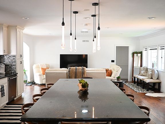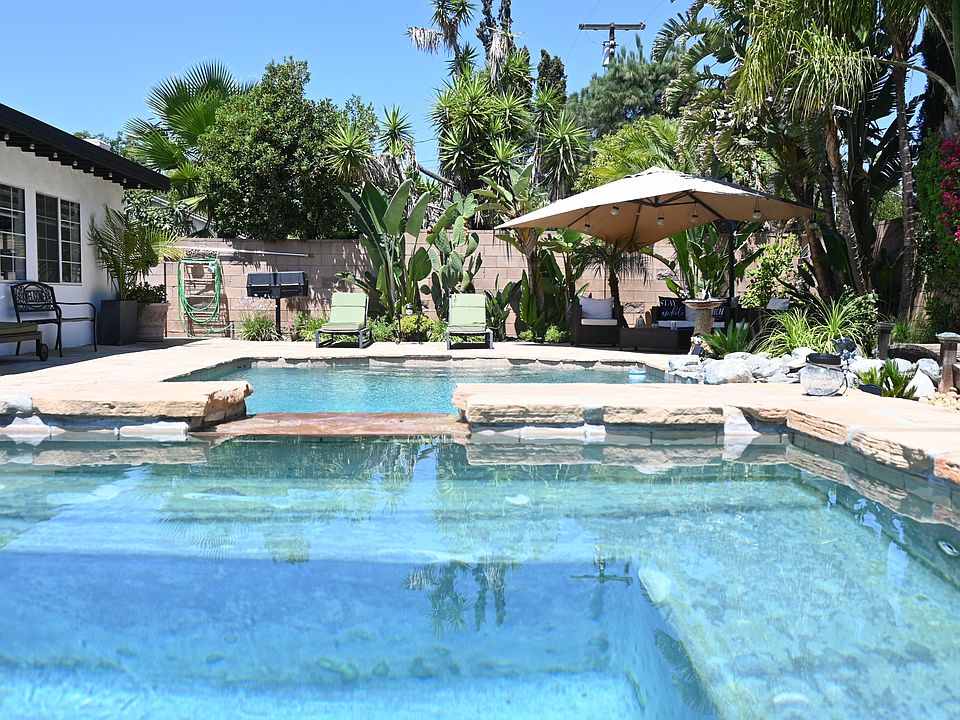 This beautiful, upgraded 4-bedroom, 2-bathroom ranch-style pool home in the heart of Chatsworth combines modern amenities, thoughtful design, and an ideal location. Spanning 2,200 sq ft on a single level, the home is built around a serene open-air atrium that fills the space with natural light and creates a seamless indoor-outdoor flow. Two spacious living areas offer plenty of room to relax or entertain, including one with a cozy fireplace and seating perfect for morning coffee or quiet evenings. The fully remodeled kitchen is a true centerpiece, featuring KitchenAid stainless-steel appliances, granite countertops, and a 9-foot island that doubles as a dining table for six. With multiple eating areas and an open layout, it's ideal for gatherings with family and friends. The primary suite is a private retreat with a king bed, walk-in closet, updated ensuite bathroom, flat-screen TV, and backyard access. Two guest bedrooms include queen beds and ample storage. The fourth bedroom features 2 twin size beds. A second open lounge area is perfect for unwinding or working out, complete with fitness equipment and another TV. Step outside into a private oasis with a pool, spa, and waterfall fully upgraded and controllable via smartphone app. Surrounded by vibrant bougainvillea and mature fruit trees, the backyard also features a flagstone patio, outdoor furniture, a built-in BBQ island with sink, mini fridge, and a separate double gas grill ideal for entertaining. The home also includes an attached garage with space for one car, which conveniently houses the in-unit laundry area. In addition, a private driveway in front of the garage provides parking for two more vehicles, offering both functionality and ease for everyday living. This home offers the perfect balance of suburban tranquility and urban convenience. Enjoy easy access to the 118 Freeway, CSU Northridge, local parks, hiking and equestrian trails, and a variety of shopping, dining, and grocery options just minutes away. The area is known for its peaceful, residential vibe while still being close to everything you need for day-to-day living. Owner pays for fixed utilities.