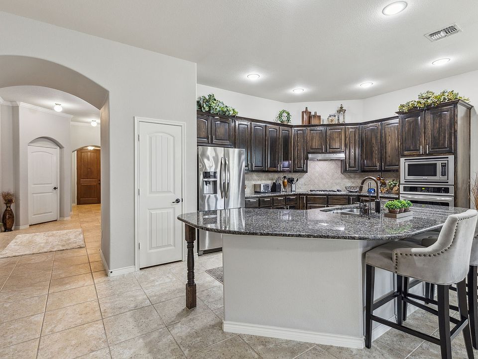 This pristine single-story home has great curb appeal, nestled in the master-planned community of Westridge, and located in PROSPER ISD! Smarty designed with functionality in mind, offering 3 bedroom, 2 full bath, and lots of natural light highlighting the soft neutral colors, arched entries, an elegant formal dining room, and a thoughtfully designed living room that opens to the kitchen area - perfect for casual dining area for easy entertaining & socializing while cooking! Equipped with stainless steel appliances, gas burner cooktop, granite countertops, and anchored by a large island! The split primary bedroom includes an en-suite bath with a large walk-in closet, dual vanities, a glass-enclosed shower, and relaxing soaking tub to unwind after a long day! Enjoy the fully fenced backyard with a covered patio and extended slab, extended Patio plus tons of yard space for a trampoline, playscape, and garden for all those green thumb enthusiasts. New Roof 2021, Carpet 2021, Paint 2021.