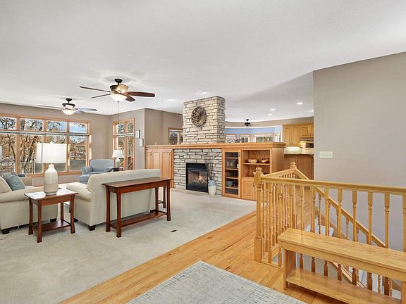 Enjoy one-level living in this custom Hanson-built home, backing to serene woods for ultimate privacy. The main level features a spacious primary suite, updated kitchen with Cambria countertops, a hearth room with a two-sided fireplace, and 9-foot ceilings with large windows showcasing the private backyard and gazebo. Meticulously cared for, this home boasts numerous updates, including new doors, steel siding, gutters, AC/furnace, water heater, water softener, flooring, light fixtures, and a maintenance-free deck. The lower level offers great entertaining space, two bedrooms, and a room to add a fourth (just need a window). Nestled in a tree-lined neighborhood next to Elm Creek Park Reserve, this home offers the perfect blend of comfort, quality, and nature.