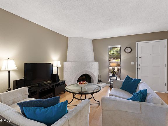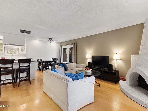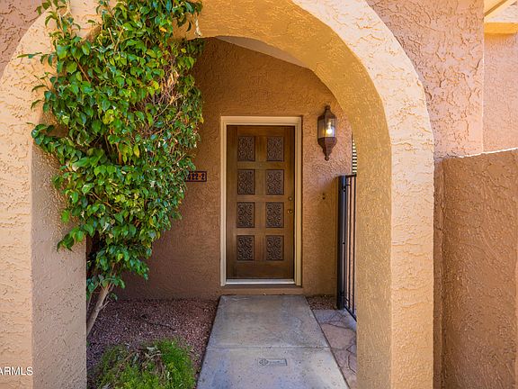 Charming 2 bedroom, 1.5 bath townhome in desirable Pointe Tapatio. Enjoy resort style living, tucked away into the mountains, with mature trees and green belts. You will love living in this quiet community which offers 4 pools and spas, clubhouse for community events and walking paths. Enjoy the outdoors on your expansive patio, one of the largest in the community! Updates include engineered hardwood floors, kitchen cabinets, bathroom vanities, and granite counters. The open floor plan is perfect for entertaining with a spacious living area featuring a Kiva fireplace, breakfast bar and dining area with French doors. Close to hiking, shopping, dining, & entertainment minutes to the 51 Freeway. HOA includes water, cable, exterior & roof.