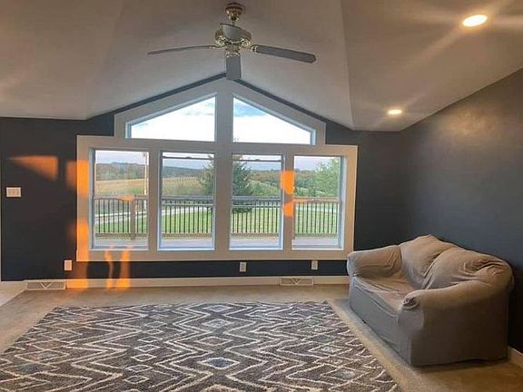 You'll Love this view!! Spacious ranch nestled on a hill. 3 Plus Bedroom, 2 Bath home with open floor plan, Kitchen with snack bar and dining area, Patio doors leading to back yard, large front deck, full basement with partially finished bonus rooms (Rec Rm has concrete floor). Two oversized garages offering more than enough room for parking and all the storage. 2 Car Detached and insulated 3 plus car detached garage. All located on 2 plus acres, located close to nearby lakes and recreation and less than a mile to the golf course!!