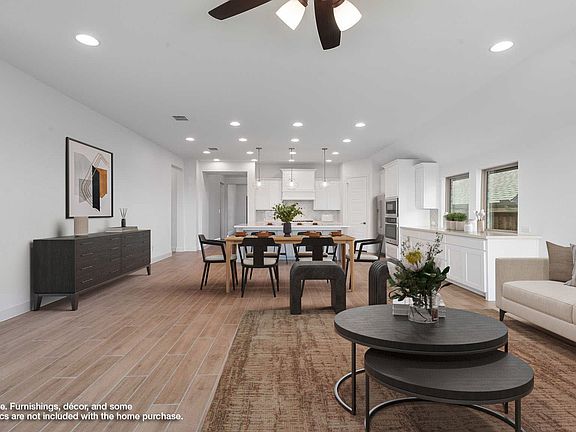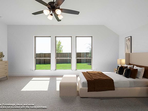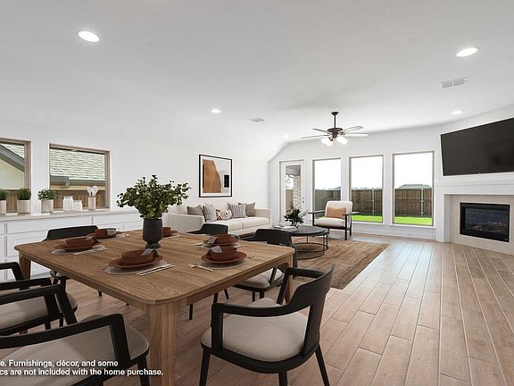 Extended entry highlights 12-foot coffered ceiling. Home office with French doors set at entry. Dining area flows into open family room with a cast stone fireplace and wall of windows. Open kitchen offers extra counter space, 5-burner gas cooktop, corner walk-in pantry and generous island with built-in seating space. Spacious primary suite. Double doors lead to primary bath with dual vanities, garden tub, separate glass-enclosed shower and two walk-in closets. Private guest suite with full bathroom and walk-in closet. All bedrooms include walk-in closets. Covered backyard patio. Mud room off two-car garage.