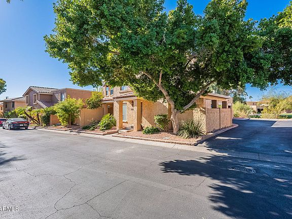 Nestled at the base of North Mountain in the highly desirable Pointe Tapatio community, this beautifully updated 2-bedroom, 1.5-bath townhome blends modern comfort with timeless charm. This end unit, offers enhanced privacy with a paver patio and courtyard that border a scenic wash, with beautiful mountain views creating a peaceful retreat. Stylish updates throughout include renovated bathrooms, contemporary lighting, a sleek galley-style kitchen with stainless steel appliances, granite countertops, a trendy hood vent, and newer dual-pane windows. Rich, moody paint colors, a built in credenza and a modern fireplace add a touch of sophistication. The open-concept layout, with French doors leading to the private patio, is perfect for both entertaining. Community amenities include heated pools, spas, a recreation center and access to miles of hiking and biking trails within the North Mountain Preserve. Additional perks include extra storage in the carport with built-in cabinets.