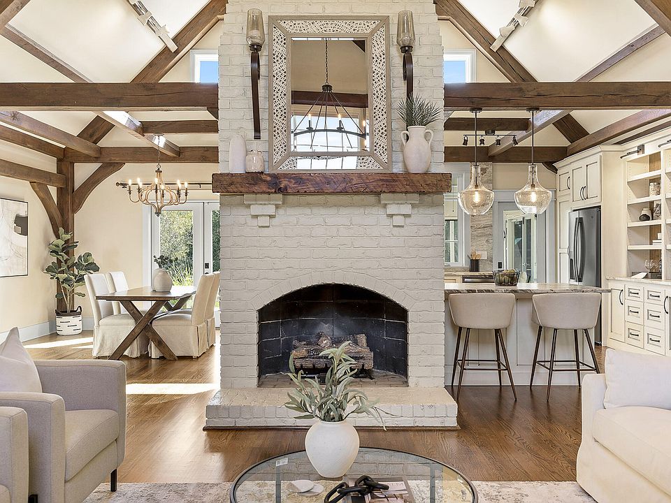 • Breakfast Bar, Beamed Ceilings, Built-in Features, Bookcases, Cathedral Ceiling(s), Cedar Closet(s), Ceiling Fan(s), Chandelier, Double Vanity, Granite Counters, High Ceilings, His and Hers Closets, Open Floorplan, Pantry, Primary Downstairs, Stone Counters, Vaulted Ceiling(s), Walk-In Closet(s), Separate Shower, Tub/shower Combo, En Suite, Breakfast Room, Split Bedrooms