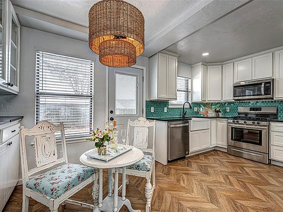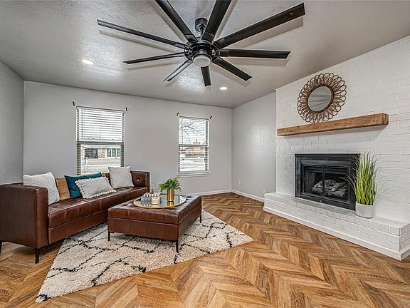 Completely updated, this adorable HOME looks like it jumped from the pages of House Beautiful Magazine. Great location in Yukon (Mustang schools) with quick access to I-40 & the turnpike. Designer colors inside and out starting with the freshly painted brick and exterior trim. You will love the gorgeous herringbone pattern wood-look vinyl plank flooring that extends throughout the whole house. In the big open living room you’ll find a brick hearth fireplace with wooden mantle and a modern oversized black ceiling fan.