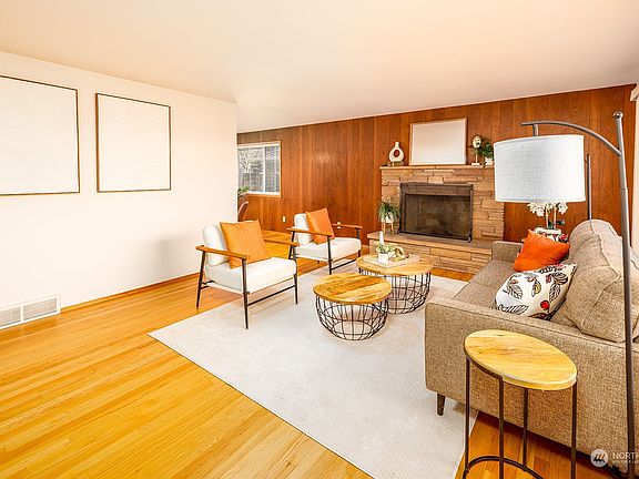 Custom built, inviting mid century brick home w/views of city & Cascade mtns awaits its new owner! Spacious living room & wood burning fireplace w/pristine hardwood floors welcomes you inside. Dining room that easily seats 8 overlooks large & private back yard and is open the the classic kitchen w/tons of storage and beautiful original cabinets. 3 main floor bedrooms & full bath complete the main floor. LL w/cozy fireplace, high ceilings & cool retro paneling family room, extra bonus room off garage & huge utility/laundry/mud room/workshop w/access to the backyard. Large fenced yard with mature landscaping and garden space, deep secure and dry garage updated windows throughout the home and storage everywhere! A true classic gem!