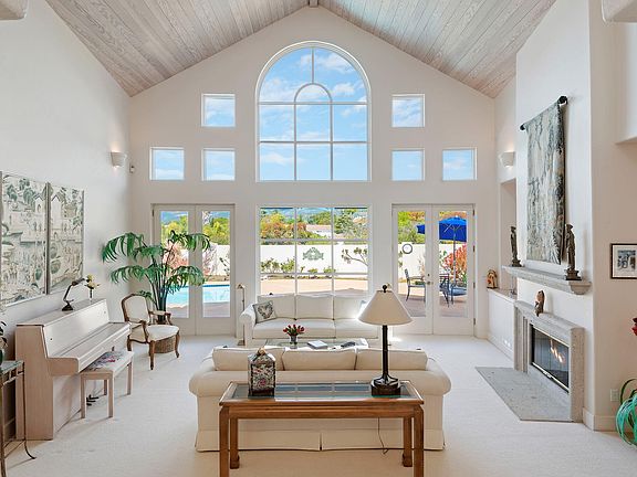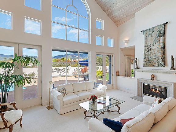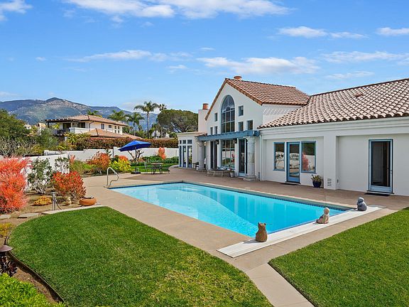 A rare offering in Rancho San Antonio, a premiere neighborhood in the Mountain View School District set amongst the Santa Barbara foothills! This spectacular 4 bedroom, 3.5 bath Mediterranean home sits on an approximately 3/4 acre lot with stunning ocean, island, and mountain views. Upon entering, you are greeted with a dramatic arched entryway that seamlessly transitions to the light/bright living room with dual-sided fireplace, lofty vaulted ceilings and two sets of French doors leading to the outdoor entertaining space. The formal dining room features a wet bar/sink with built-in banquet and ample storage. The kitchen is equipped with a large center island with gas range, Sub-Zero built-in refrigerator, and a breakfast area with ocean/island views. The generously sized primary suite has beautiful southwest facing ocean and island views, two walk-in closets, and French doors leading to the garden. The primary bath offers a dual sink vanity, jetted ocean view soaking tub and separate shower. Two of the additional hall bedrooms also have exterior access to the private backyard, while the fourth bedroom enjoys access out to the front area garden and works well as a home office. In addition, there is a generously sized laundry room, powder room, large storage/utility room and 3-car garage. Outside, a spiral staircase leads to a rooftop 360-degree view deck, offering stunning panoramic views from UCSB to Carpinteria on a clear day. Set upon a flat useable lot with a sparkling pool, lush lawn, roses, fruit trees, all framed with mountain views- this home is perfect for indoor outdoor living. Don't miss out on the rare opportunity to make this special offering your dream home!