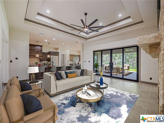Nestled within a gated community and surrounded by the natural beauty of Texas Hill Country, this stunning new construction home offers all the bells and whistles you could ever need. Enjoy 1.06 acres of level land that's perfect for entertaining or simply enjoying your own private oasis. Inside, you'll find 4 spacious bedrooms -- each with their own en-suite full bathroom featuring rain head showers with jetted system in primary bath -- as well as a dedicated office equipped with custom built bookcases & desks, large family room boasting stone fireplace & custom built bookcases, leathered granite countertops throughout kitchen and bathrooms, large game room complete with stone fireplace, oversized covered patio with fireplace & artisan grill for outdoor entertainment & dining pleasure. Located just walking distance from Guadalupe River activities such as fishing and kayaking--you get the best of both worlds when it comes to city living meets country life.