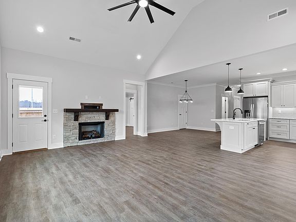Flat terrainFully fenced backyardCovered porchTile showerOpen floor planUpscale finishesLarge kitchen