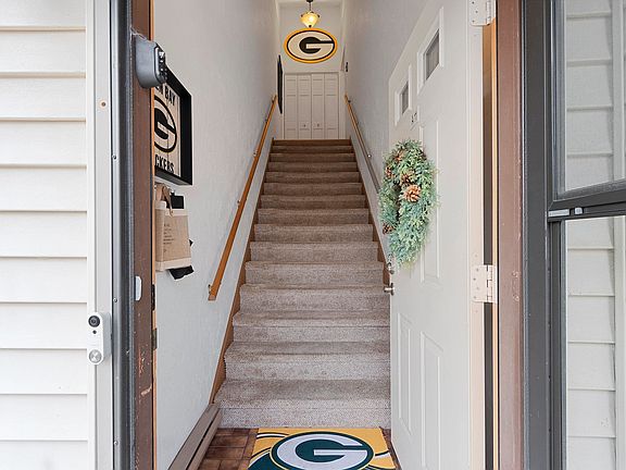 Unbeatable Gameday Living! Experience the ultimate Green Bay lifestyle in this beautifully updated 1182 Sq ft, 2-bed, 2-bath condo, moments from Lambeau Field. The move-in-ready, upper corner unit offers a private entrance for the owner-occupant who wants to soak in the gameday atmosphere. Step inside a bright, open space featuring new lighting and a double-pane patio door leading to your private deck. The kitchen shines with contemporary updates, including an integrated sink with a modern touchless faucet. Relax in the beautifully updated primary en-suite. Enjoy the convenience of in-unit laundry and peace of mind with newer windows and roof. A dedicated one-stall garage and extra basement storage are also included. Walking distance to Lambeau Field and Titletown. Allow 48 hrs binding!
