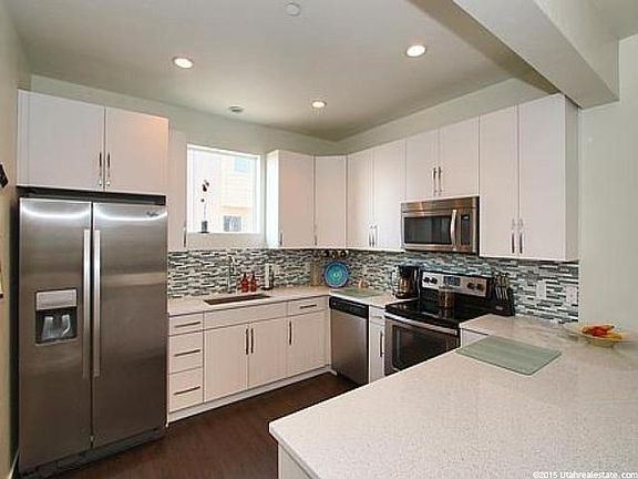 Just like new Modern townhouse design with thousands in upgrades. Beautiful rooftop patio overlooking the courtyard with a water feature and fire place. HUGE master suite!!! Big 2 car garage, lots of storage, awesome community conveniently located right next to the Jordan River Parkway, Trax, shopping and quick freeway access. Very easy to show with notice!