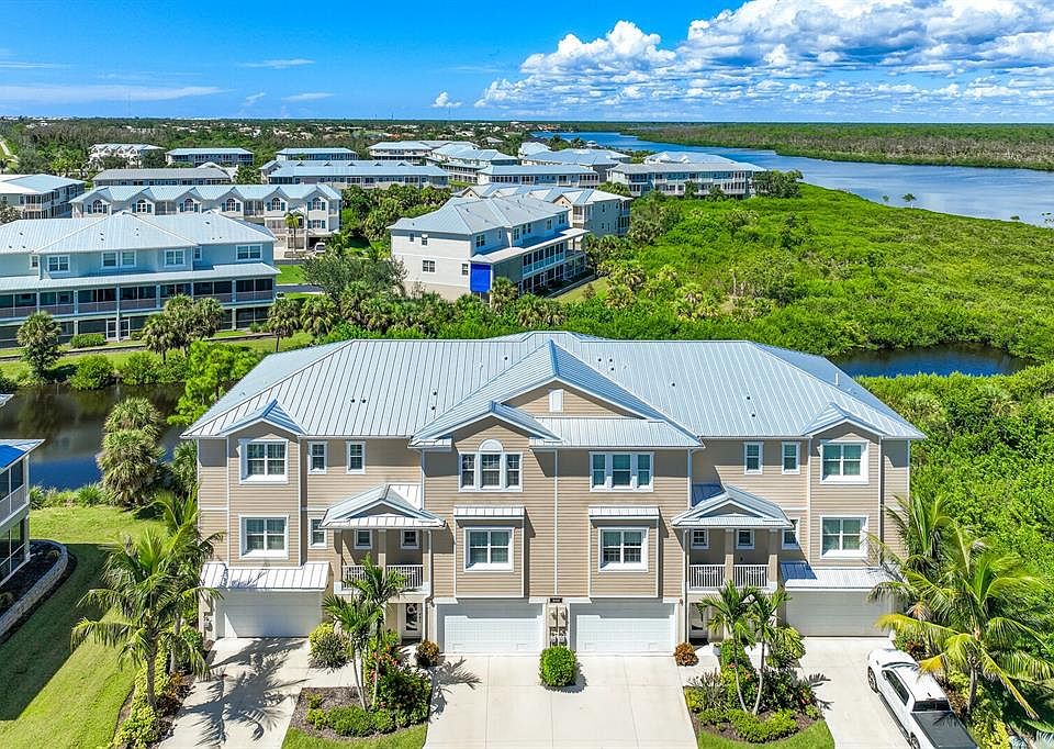 This stunning, rarely available end unit townhome, built in 2020 and meticulously maintained, is nestled in the Landings at Coral Creek, a prestigious gated community just minutes from the pristine shores of Boca Grande. Situated on a tranquil cul-de-sac, this exquisite residence boasts breathtaking views of Coral Creek and offers 2,620 square feet of luxurious living space. Inside, you'll find 3 spacious bedrooms, each featuring ensuite baths, along with an optional 4th bedroom or den. The main living area showcases an open floor plan filled with natural light, seamlessly connecting to a beautiful kitchen adorned with elegant granite countertops, a stylish tiled backsplash, and solid wood cabinetry. Step out onto one of the two expansive screened lanais, where you can relax and soak in the serene views and vibrant wildlife of Coral Creek. The main floor also includes a den or 4th bedroom and a convenient half-bath. Upstairs, the primary bedroom offers captivating water views, complemented by a spa-like master bath with dual vanities, a large soaking tub, a separate shower, and a generous walk-in closet. Down the hall, two guest suites feature their own ensuite full baths, ensuring comfort and privacy for family and friends. Natural light pours in throughout the home and is enhanced by beautiful plantation shutters. A whole house elevator provides easy access to all floors. The spacious garage accommodates up to 4 vehicles and includes a storage closet and an additional large, screened lanai. Recent upgrades include a new tiled lanai (2025), dishwasher (2024), roof (2023), soffits (2023), under cabinet lighting, custom soft close cabinetry in the laundry and closet, and additional electrical outlets in the garage. Both lanais are fitted with no-see-um screens, creating the perfect setting for enjoying wildlife and breathtaking sunsets. The Landings at Coral Creek offers exceptional amenities, including a resort-style pool, community dock, fitness center, tennis and pickleball courts, kayaking, and fishing. This community offers planned social events in their sophisticated clubhouse where you can enjoy a library, fireplace, TV room, and dining area.