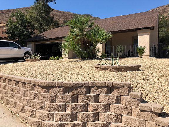 **Front yard newly landscaped with low maintenance river rock, retaining walls and drought tolerant plants