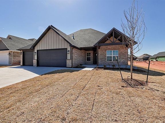 This 5-bed, 3-bath home in the brand new Canyon Ridge Estates addition in Mustang is just minutes from Yukon, Tuttle, and the John Kilpatrick Turnpike. A new elementary school is under construction just up Sara Road. The floor plan includes an open concept living area into the kitchen and dining nook, with wood-look plank tile in the common areas and carpet in the bedrooms and closets. The primary suite features separate his/her vanities, a spacious walk-in closet, luxurious walk-in shower with multiple shower heads, and a jetted tub. The home has a 3-car garage and covered back patio.
