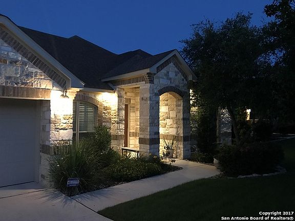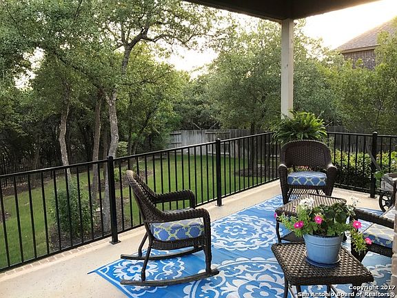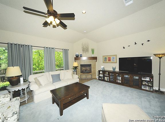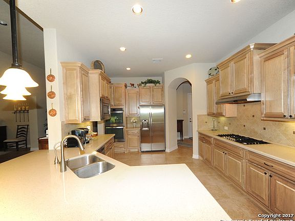 Gorgeous Sitterle Home in Gated Helotes Community of Triana! One Story, 3 bedroom, 2 1/2 bath, Office/Study Ashbourne Model with Upgraded Entertainment Kitchen Package. Omega Stone Kitchen Countertops, Convection Double Ovens, 5 Burner Gas Cooktop, Samsung SS Fridge.High ceilings, Open Floor Plan, Separate Dining Room plus Large eat-in Kitchen, Great Room with Gas Fireplace. Solar Panels, Extra Large Lot Located on Greenbelt, Covered Patio with adjoining Deck with built-in Storage. Perfect for Entertaining.