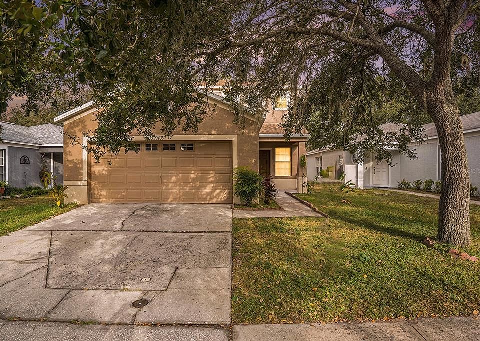 One or more photo(s) has been virtually staged. Seller to Give $5,000 towards Buyers Closing Costs! Welcome to this beautifully maintained home in the highly desirable Cross Creek community! This charming single-family residence offers the perfect balance of modern comfort and suburban appeal. Enjoy peace of mind with a roof replaced in 2019, a new A/C system installed in 2021, NO CDD fees, and low HOA dues! Freshly painted inside, this home welcomes you with soaring cathedral ceilings that extend from the living area all the way up to the second floor, creating a bright and open atmosphere the moment you walk in. The open-concept living and dining areas flow seamlessly into the spacious kitchen complete with a breakfast bar—perfect for casual dining or entertaining family and friends. The backyard offers a shaded and comfortable outdoor space, providing just the right amount of room for relaxing or hosting guests. This home features 4 spacious bedrooms and 2 full bathrooms, offering ample space for everyone. The first-floor primary suite is a peaceful retreat with a walk-in closet, and plenty of natural light. Upstairs, you’ll find three additional bedrooms and a full bath, ideal for family, guests, or a home office setup. Conveniently located near shopping, the Tampa Premium Outlets, dining, top-rated schools, I-75/I-275, Tampa International Airport, downtown Tampa, hospitals, and golf courses—this home delivers the best of both worlds: comfort, convenience, and community.