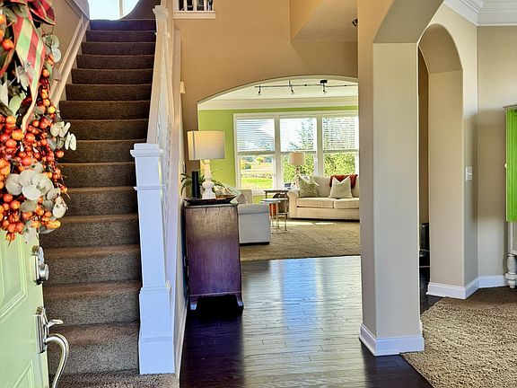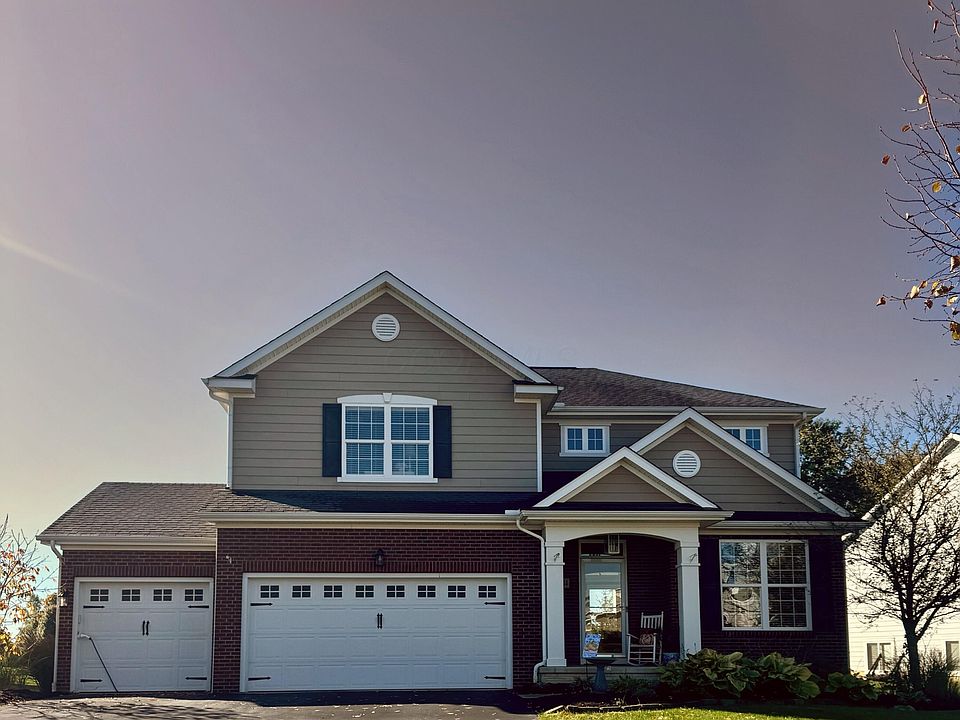 Welcome to this beautiful, well-maintained home where function and comfort live harmoniously. Situated on a beautifully landscaped golf course lot, this spacious home offers exceptional curb appeal with a welcoming front porch and large 3 car garage complete with workbench and tool storage. The backyard is a crowning jewel with its large deck and brick patio surrounded by tall grasses and trees. The Sunbrella retractable awning over the deck offers shade when needed. Step inside to a thoughtfully well-designed open kitchen and eat-in area that gives every buyer the feeling of home. The kitchen opens into the sun filled family room where you can cuddle up by the fireplace. The large windows and sliding glass door provide you with a stunning view of the Glenross golf course and pond. Enjoy meals in the warm and inviting kitchen with stainless steel appliances and large pantry. The laundry room offers ample space with shelving to store all those extra items. The main level also offers a flex room that the buyer can use as a reading room, office, or dining room. Look up to notice the beautiful crown molding running throughout the first floor. The second floor offers a spacious owner's suite, with a spa-like ensuite bathroom w/ dual vanity, soaking tub, and large WIC. Secondary bedrooms are generously sized and equally well appointed with access to a full bath. The open bonus area at the top of the stairs is ideal for game night, movies, or just relaxing. The full basement includes a full bathroom and can be used as a recreation room or transformed into an in-law suit. This golf course community features a clubhouse, fitness facility, basketball court, walking path, frisbee golf course, pool & park. Come make this your home! Light fixtures in hall bath and master bedroom do not stay. Some furniture is negotiable. Carpets are newly cleaned and the second floor is freshly painted. There is an EV circuit in the garage for the new owner to connect to an outlet.