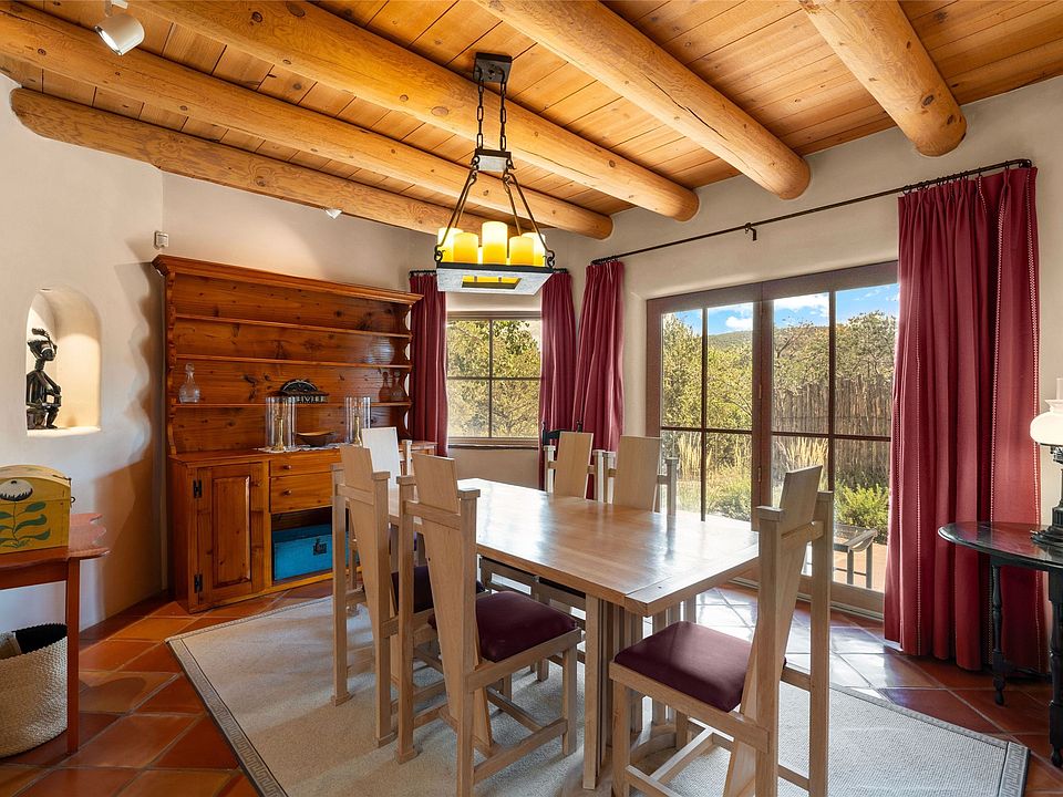 Prime Northside 3-bedroom, 2.5 home sited amidst Aspen and Piñon trees with stunning views of the Sangre de Cristo Mountains. This single-level residence features no interior steps. Embracing the iconic Santa Fe style, the home showcases Saltillo tile floors, banco seating, and elegant plaster walls, complemented by traditional vigas and latillas. Two kiva fireplaces add warmth and character. The separate dining area offers captivating views of the Sangres, creating a delightful backdrop for mealtime. The updated kitchen is designed with a large island for casual seating and French doors that open to a covered patio, ideal for outdoor dining or relaxation. The primary suite features its own kiva fireplace, along with a separate office or exercise space and an outdoor patio. Additionally, the home includes a two-car garage with extra storage, enhancing convenience. Surrounded by natural landscaping, this property offers a tranquil setting while being just under two miles from the vibrant heart of downtown Santa Fe.