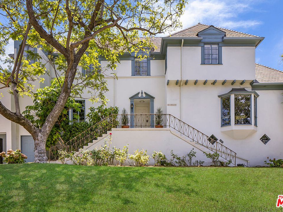 Stately Little Holmby residence, in need of some updating, sits on an elevated corner lot with an expansive pool, grassy sideyard and living spaces with high ceilings. The center foyer gives access to the grand living room with leaded windows and original fireplace, as well as a spacious dining room perfect for family gatherings and entertaining. The adjacent butler's pantry seamlessly flows to the kitchen and breakfast room with access to the outdoor dining terrace and lush garden area. The family room/library with fireplace and indoor/outdoor bar moves easily to the lounging terrace and pool. A guest suite is conveniently located on the main level. Upstairs are the primary bedroom, bath and dressing area with walk-in closet; a small bedroom/office, two additional spacious bedrooms each with bathroom en-suite and a large attic. The guest/pool house with bathroom could also function as a gym/yoga room with views over the gardens, pool and terrace. Easy to show!
