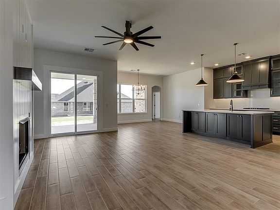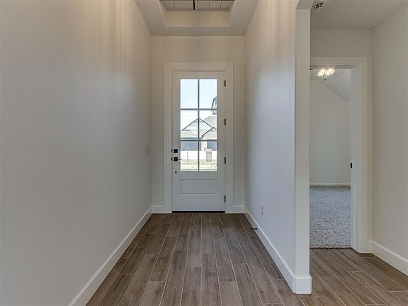 Don’t miss this beautifully crafted home in the desirable Mustang area, built by Quality Designed Homes with high-end finishes and thoughtful design throughout. Brand new school Sunset Elementary right next door! The open layout features 10’ raised ceilings in select areas, hand-textured walls, archways, and designer tile. The gourmet kitchen is a chef’s dream with floor-to-ceiling cabinets, built-in microwave and oven, stainless gas cooktop, quartz countertops, under-cabinet lighting, farm sink, painted cabinets, and modern black fixtures. The spacious master suite offers dual vanities, and a large shower with modern glass enclosure, and free standing soaking tub. The oversized laundry room connects directly to the master closet for added convenience. Secondary bedrooms offer generous space, with the 4th bedroom easily used as an office. The guest bath features a tiled tub/shower combo, and a stylish half bath is conveniently located near the main living area for guests. Interior extras include a barn door, gas log fireplace, ceiling fans in all bedrooms, and cable-ready living and office areas. Energy-efficient features include Low E insulated windows, R-15 wall & R-38 attic insulation, 95.5% furnace with 14 SEER AC, ZIP System sheathing, and a 40-gallon gas water heater. Exterior highlights: brick with cedar/siding accents, 30-year shingles, full sod yard, sprinkler system, seamless gutters, insulated garage doors, oversized attic stairs, and full landscaping package for great curb appeal. Luxury, efficiency, and style—schedule your showing today!
