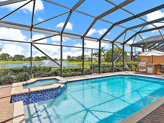 IMMEDIATE PREMIER GOLF MEMBERSHIP AVAILABLE. This spacious and upgraded 4BR/3.5BA+Den ''Martinique'' model offers one of the most dramatic water and golf views in all of South Florida. Designed to impress, the home features soaring 22-foot ceilings that frame breathtaking vistas both inside and out, creating a light-filled, open feel throughout.Recent major upgrades provide peace of mind for the new owner, including a brand-new 2025 roof, two new HVAC systems (installed December 2023), and a whole-house 22KW Generac generator with transferable warranty. Accordion shutters and clear storm panels add an extra layer of protection, ensuring the home is fully prepared for all seasons. The outdoor living space is equally impressive. A large screened enclosure (2012) surrounds a generous covered patio, an outdoor shower, a summer kitchen, and a completely retiled and replastered pool and spa (2022). With long "forever" water and golf views, this private setting is ideal for both entertaining and quiet enjoyment.