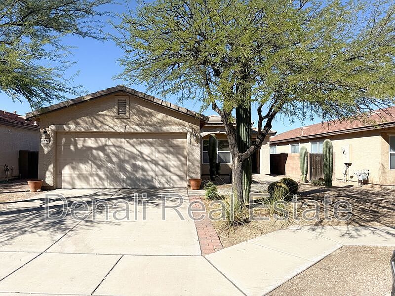 No Application Fees! Beautiful single level 3 bedroom plus Den, 2 bathroom Tucson home with stunning mountain views located in the Mesquite Ranch community. This open floor plan home features laminate flooring throughout the main living areas with carpeting in the bedrooms, warm two-tone neutral paint, upgraded two-inch wood blinds, and ceiling fans in each room. The spacious living room flows into the upgraded kitchen which includes extended countertop space, an island with breakfast bar, a separate dining area, electric range, built-in microwave, dishwasher, and refrigerator. The oversized primary suite offers backyard views, two closets, and a private bathroom with dual sink vanity and step-in shower. The versatile den provides additional living space for a home office, game room, or guest space. A washing machine and dryer are included, and the two-car garage offers ample parking and storage. The backyard is designed for relaxation and entertaining with a covered patio, extended paver patio, elevated pergola-covered sitting area, synthetic grass, easy to maintain desert landscaping, and exceptional mountain views. Located in East Tucson near parks, schools, shopping, dining, and with convenient access to I-10 for commuting throughout the Tucson area.