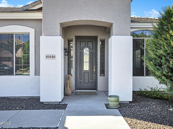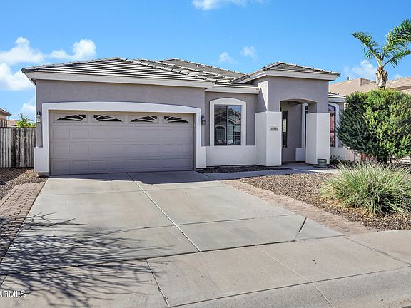 This lovingly maintained home offers a spacious floorplan with 3 bedrooms, 2 bathrooms, a large great room, and flex/office that can be used as a fourth bedroom. An upgraded kitchen the is open to the living room boasts upgraded granite countertops, dark stainless-steel appliances, and plenty of prep space. As you make your way into the large primary suite you will notice that it offers a unique bonus area, perfect as a reading nook, gym, or private office as well as an ensuite with soaking tub and separate shower. A unique feature of this floorplan is seen in one of the two guests' rooms that offers direct access to the guest bathroom. Looking for a large backyard with some privacy? This home has that covered as well. The large backyard provides privacy with its mature trees, lush grass, and desert landscaping, ideal for entertaining or relaxing. Community amenities feature playgrounds, basketball courts, open green areas, and direct access to Augusta Ranch Golf Club. Recent updates include two new high-capacity AC units.