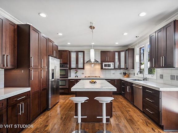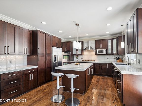 At 1045 Arbor Lane in the village of Glenview, lies this lovely abode that exudes luxury and style. Showcasing an elegant interior and a great floor plan this home offers 5 spacious bedrooms and 4.5 exquisite bathrooms. The spacious open-concept kitchen, breakfast nook, den, and family living areas are lined with sleek hardwood flooring and flooded with natural light pouring in from the many windows. The amazing kitchen has a traditional style with a chic, modern twist. It has rich cabinetry, high-end appliances, a butler's pantry, and an island breakfast bar. The second floor master suite boasts a private balcony, a custom walk-in closet, and a large bathroom with a separate stand up shower and jacuzzi tub. The secondary bedrooms are all generously sized 2 of which share a Jack & Jill bathroom with separate vanities. The fourth bedroom features its own full bath. Other fantastic features of this house include beautiful millwork, hardwood floors in the bedrooms and second floor laundry. An office for added privacy if you work from home, separate dining area, mudroom, exercise room. The huge recreational room in the basement offers the fifth bedroom and a gorgeous full bathroom. The backyard will be the place for summer barbeques with the beautiful bluestone patio and built in grill. The 2 car attached garage with electric car charger is another bonus! Located just two minutes from the highway and a short walk to forest preserve and bike path and Wilmette schools!