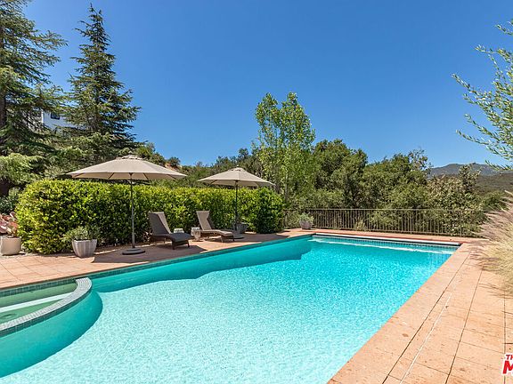 This spectacular Mediterranean home surrounded by the Santa Monica Mountains is perched on 2.8 acres and is located on an exclusive gated street in Monte Nido with only two other luxurious estates. This magical neighborhood is a hidden gem with a small-town feel, community events and friendly atmosphere. Perfectly situated near Malibu State Park, Back Bone Trail and minutes to Malibu beaches, Calabasas shops and dining, and the 101. Here, you will enjoy nature, mountain views for miles, breathtaking sunsets, soaring hawks, mornings with a sea of clouds pouring in over the mountain-tops and the trickle of a seasonal stream. The property features a heated swimming pool and hot tub, view terrace, mature trees including oaks, California sycamores, orange and plum. A beautifully landscaped courtyard welcomes you in with a fountain and fishpond. The doors open to high ceilings with dazzling Murano hand blown glass lights and soothing light hard skived white oak hardwood floors. An inviting living room offers a peaceful seating area for relaxing and enjoying the mountain views with glass doors opening to a large terrace with seating and dining areas. Inside offers an elegant dining room with windows to the views and stunning hand blown light fixtures reminiscent of the convergence of sky and ocean in Venice. A light and bright kitchen overlooks the mountains and terrace with BBQ, and features an island, Thermador appliances, and is open to a seating area with surround sound television. Retreat to the first floor primary suite with views of the sparkling pool and hot tub. The spa-like bathroom offers a separate tub, shower, and walk-in closet. A sizable second bedroom/office and full bathroom is also on the first floor. Upstairs you will find three additional guest bedrooms all with spectacular views and two full bathrooms, as well as the laundry room and bonus storage room. The home has been meticulously upgraded with Carlisle wide-plank solid oak hand-skived hardwood floors, new Lennox Signature HVAC system, Farrow and Ball Paint through-out, new AV system with TVs, speakers and control system, new pool equipment and cover, wine refrigerator, Wilson Repeaters, whole house water filter, tankless heater and the list goes on! Two car attached garage and central vac. Within the award winning Las Virgenes School system and close to Viewpoint and Muse private schools, and Pepperdine University.
