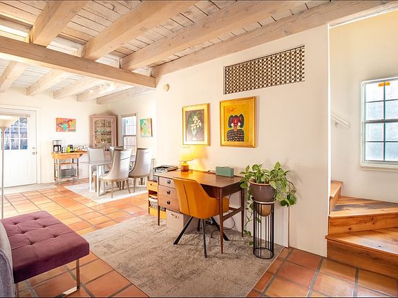This upgraded home features classic Santa Fe style with Saltillo and Talavera tile, reclaimed oak wide-plank flooring, French doors, skylights, beams, and a kiva fireplace. The main level includes open living and dining areas that flow into a remodeled kitchen and a sunny south-facing courtyard—perfect for entertaining or relaxing. Upstairs, two bright bedrooms and a full bath offer comfortable private spaces. The attached unit on the first floor has its own private gated entrance, kitchen/living space, bedroom, flex room, and ¾ bath, making it ideal for guests, tenants, or a separate small business.