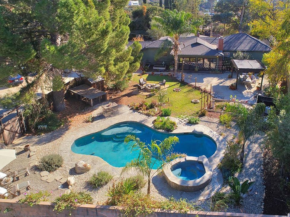 Come and own this enticing, classic California ranch-style home located on a flat lot with approximately 31,282 square feet. Nestled next to hiking trails, this single-story home features 4 bedrooms and 2 bathrooms with an inviting front porch to enjoy this beautiful Southern California weather and its park-like front yard. Step down to the living room with a fireplace and open the French doors to admire an expansive backyard oasis. The dining room has its own fireplace and charming, vaulted ceilings. The kitchen has a center island, imported Mexican tile floor, plenty of cabinet spaces, and stainless steel appliances. The master bedroom has hardwood floors, a walk-in closet, and ensuite bathroom. A second bathroom with updated stone, tile, and copper double sinks serves the other three, spacious bedrooms. Updated double-paned windows are also wonderful features of this home. Outside play becomes an event when you have a pool, spa, fire pit, pond, gazebo, playhouse, shed and workroom -- perfect for all your tools and toys!! Only minutes from the Rose Bowl, JPL, Old Pasadena and La Caada Flintridge, this is the perfect home for you to create lasting memories for generations to come!!