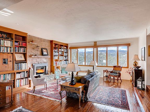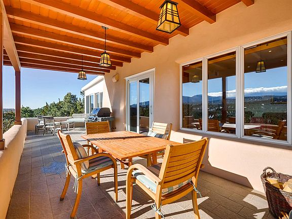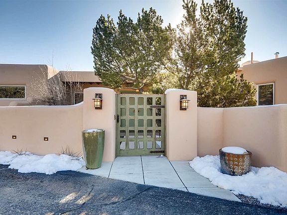 Located in the desirable Vista Encantada neighborhood, just 5 minutes north of the historic Plaza, this 4 bedroom, 3 bath light filled home on 3+ acres boasts a million dollar view! From the rear portal with 180 degree Sangre de Cristo views, this special house is completely renovated, new roof and electrical, between 2013 and 2017. Step through the double entry doors onto the rich hardwood floors that carries through to the living room with floor to ceiling bookshelves surrounding a gas fireplace and an east facing window wall offering mountain views. The owner's wing provides 3 bedrooms with one outfitted as an office with built in cabinets. The master has a large walk in closet, sitting room, his + her bath rooms with a shared "wet-room" with shower and soaking tub. At the other side of the house the large redesigned kitchen includes bamboo cabinets, quartz counter tops, glass tile back splash, stainless steel appliances, walk in pantry and breakfast area with wood burning fireplace. The window wall above the double sink faces the glass enclosed heated sun room with wide open views of the mountains. The south wing includes a guest room and bathroom, laundry room, large TV room and access to the garden and the attached 2 car garage. With 2-zone heat, a/c, security system, landscape irrigation system, this must see property is in move in ready condition. And did I mention the view?
