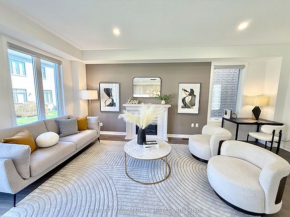 1 Yr New Gorgeous Detached Home w/ Double Car Garage in High Demand Location. Brick & Stone Exterior with Contemporary Design. 8' Double Entrance Doors with Covered Porch. 9' Ceiling on Main & the 2nd Floor. $$ Upgrades: Hardwood Flooring on Main, Pot Lights Throughout. Modern Kitchen Cabinet w/ Valance Lighting & Backsplash. Granite Countertop and S/S Appl. Large Center Island w/ Breakfast Bar. Oak Staircase w/ Iron Pickets. 4 Bdrm & 3 Baths on Upper ( 2 Master Bdrm w/ Ensuite Bath). Primary Bdrm with Access Wall, Sitting area, Study & W/I Closet. Unfin. Bsmt with Separate Entrance - Potential for In-law Suite or Rental Income. Steps to Park & Trail, Closet to Public Transit, Supermarket & Golf Course, Mins to Highways & Go Train Station..