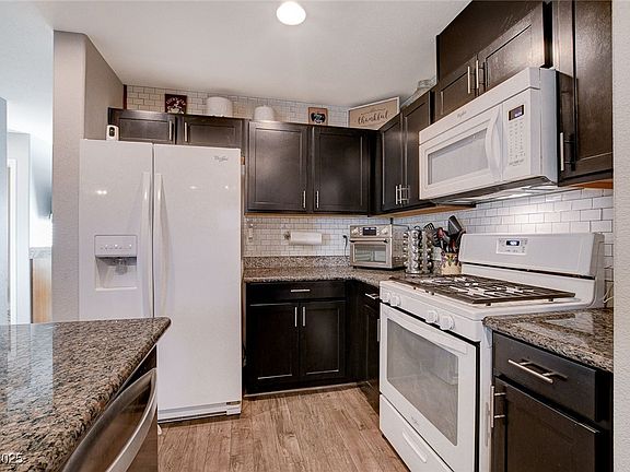 elegant granite countertops, sleek cabinets with a pantry for extra storage, and woodlook luxury vinyl