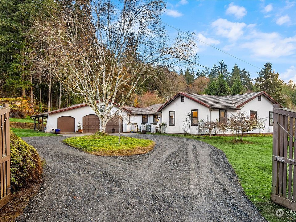 Nestled in the heart of Bainbridge Island, this single-level Mediterranean-style stucco home on 4.1 acres offers a combination of charm, tranquility, and convenience. Set on a lush, picturesque lot with several small outbuildings, those dreaming of a hobby farm will have plenty of room to be creative! Step inside to discover a thoughtfully crafted interior featuring warm hardwood floors, and a large kitchen with Quartzite counters. The arched entryways create a sense of flow and openness. The primary suite is a true sanctuary, complete with a spa-like ensuite and a generous walk-in closet. Two additional bedrooms are spacious and versatile. A detached guest casita offers ultimate privacy and charm—ideal for visiting family or a home office.