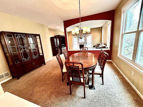Step inside to a light-filled eat-in kitchen featuring new countertops, a bar-height counter, abundant cabinetry, and large windows that flood the space with natural light. The formal dining room flows seamlessly into the living room, which opens to a private patio with serene wooded views—ideal for entertaining or quiet evenings. The patio also boasts outdoor speakers and a motorized Sunsetter awning for added comfort.