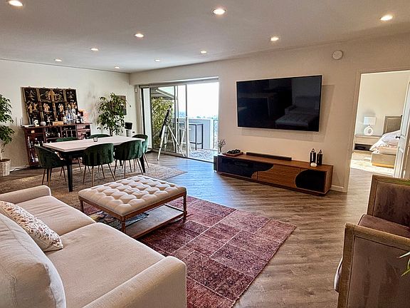 Outfitted with high-quality furniture and smart home technology, the unit includes large-screen TVs in both the living room and bedroom. The elegant bathroom features a soaking tub and separate shower, creating a spa-like retreat. With three spacious closets, a full-size washer/dryer, and a California King bed in the primary suite, every detail has been considered for comfort and practicality.