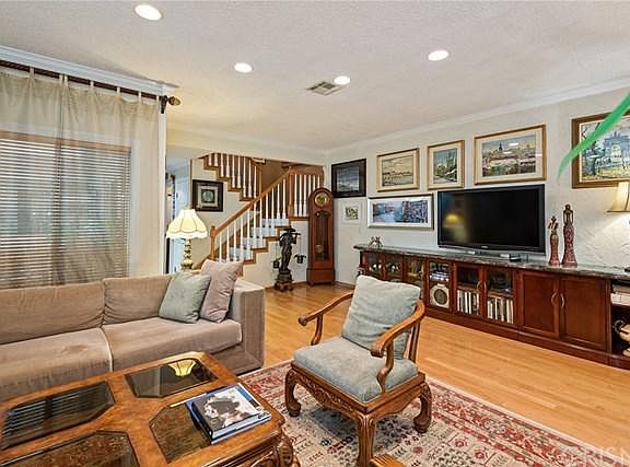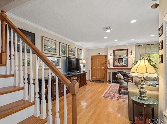 Gorgeous and highly upgraded end unit townhome in private and gated Granada Gardens * Over 1500 sf * Two separate and lovely outdoor patios - one in front and one off the kitchen * Enter through front door into living room with hardwood floors, smooth ceilings, recessed lights, crown molding and fireplace * Kitchen has been updated with beautiful wood cabinetry, stainless steel appliances, slab granite counters and backsplash, double sink, crown molding, recessed lights and tile floors and breakfast room with chandelier and wainscoting * Remodeled downstairs bathroom * Direct entry two car garage with laundry*Upstairs are 3 big bedrooms - 2 with a shared balcony*Newly remodeled upstairs bathroom with tub and shower combo, wainscoting, pedestal sink and gleaming white tile floors * Parquet wood floors lead to and throughout main bedroom suite which features high ceilings, crown molding, walk-in closet, sitting area, and classy private bathroom with dual sinks, granite counters and shower surround * Complex features pool and spa * Located walking distance from highly acclaimed Granada Hills Charter HS * Easy access to CSUN, shopping, bus lines and more ***