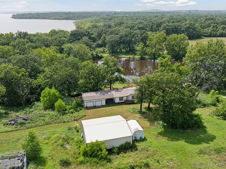 Secluded waterfront ranch located on 92+ fully fenced acres fronting Lake Eufaula's north shore with over 900 feet of shoreline, this is the only property to own land going into the shoreline and into the water. This workable ranch contains two ponds, one stocked and several outbuildings including a fabulous treehouse at the waters edge. As much fishing, hunting, camping, Jetskiing, boating, motorcycling, dirt biking and entertainment as your heart desires. Updated 3 bed 2 bath 1500 sqft mobile home with attached oversized 2 car garage. Ranch's primary outbuilding is a 40 x 40 concrete floor shop with electric and 3 overhead doors. The secondary outbuilding is a multi-story multi-room treehouse with large deck. The large stocked pond sits just off the homes back deck. 15 minutes from Checotah and HWYI 40. 30 minutes from Eufala State Park. Enjoy the sunset on your back patio watching deer or fish Lake Eufaula or your pond. The property provides for the launching of power sports with an ATV or like. Perfect for fishing, hunting, horses, other Ag, ranch or business uses. This property could be the foundation for your retirement compound or estate on beautiful Lake Eufaula State Park. No restrictions. Property also has 2 green houses and additional 800amp is available. So much potential for so many things. Enjoy peaceful country living near town for all your needs. A COZY BRAND NEW TREE HOUSE WITH LARGE DECK BY THE WATER OF LAKE EUFAULA. A perfect place to relax and listen to the waves. You must come and experience the breathtaking natural surroundings that will bring you tranquility and solace. The tree house has full bath with shower, it is perfect for guest room or airBNB on hunting season.