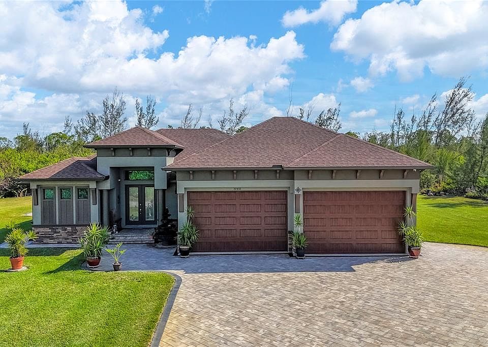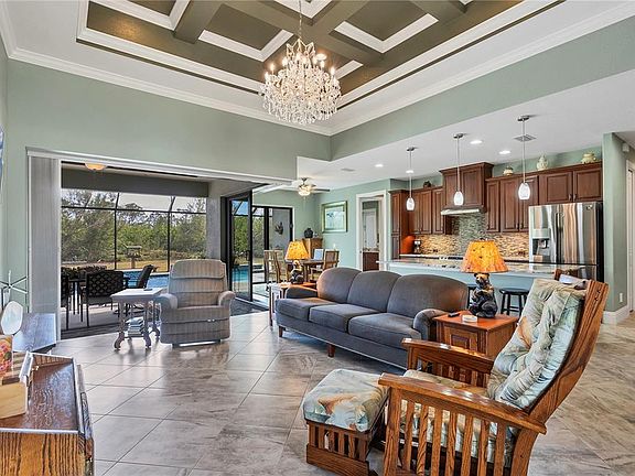 Experience luxury, privacy, and unbeatable value in this stunning custom built 2020 home featuring a brand new roof (May 2025) and exceptional upgrades throughout. Perfectly situated on three spacious lots, this meticulously maintained residence offers 1,818 sq. ft. of thoughtfully designed living space with 3 bedrooms, 2 bathrooms, and elegant finishes at every turn. Inside, you’ll find 12-foot coffered ceilings, a central vacuum system, and a hot water circulation system for everyday comfort. The gourmet kitchen is both stylish and functional, highlighting solid wood cabinetry, granite countertops, a walk-in pantry, and an open layout ideal for cooking and entertaining. The primary suite serves as a true retreat, featuring a spa-like ensuite bathroom with dual vanities, granite countertops, and a walk through shower with multiple shower heads, a perfect blend of comfort and sophistication. Step through the zero-corner sliders into your private outdoor haven. The expansive lanai showcases a wood accented ceiling, heated pool and spa with LED lighting, and a kitchenette, perfect for enjoying year-round Florida living. Additional highlights include a recently updated 4" column irrigation well supplying 55 spigots across the property for effortless maintenance, an oversized garage accommodating 4–5 vehicles with a workshop area and ceilings tall enough for a lift, plus a 40-foot paver driveway and custom hardscaping for exceptional curb appeal. Conveniently located between Sarasota and Fort Myers, you’ll enjoy quick access to world-class fishing, championship golf, pristine beaches, fine dining, and boutique shopping. This move-in-ready home perfectly blends luxury, comfort, and functionality, a rare find in today’s market. Schedule your private showing today. Paradise awaits you!