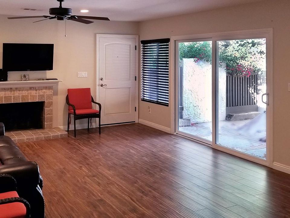 This picturesque, 1 story, 1068 sq. ft. 2 bedroom, 2 bath townhome is ABSOLUTELY GORGEOUS!! This unit is immaculately remodeled and includes a private, attached 2-car garage with full-size washer/dryer. The interior features tons of natural light, an open, spacious floor plan, beautiful wood-laminate plank flooring throughout, natural stone Travertine tile in kitchen and baths, recessed lighting, modern ceiling fans, and Central Heating and A/C, all of which make living here a true pleasure. A Luxurious Chef's Kitchen includes all energy efficient, new stainless steel appliances: Dishwasher, Refrigerator, Oven (with built-in microwave), and Glass Top Stove. It also includes beautifully designed granite counters and Shaker cabinets. Not only that, but the stainless steel sink even has Filtered Water - an amazing upgrade! The expansive master bedroom suite with ensuite bathroom and master closet is a delight! There are loads of cabinets and storage space everywhere. In addition, Solar Panels for hot water provide a huge perk, and offset your utility bill! This space feels expansive, as the open floor living room/dining area overlooks a spacious, private, peaceful patio, while the kitchen opens up to a 2nd private garden patio (with direct access to the garage). There is lots of room to lounge, garden, and enjoy! Rockpointe is one of the most sought-after complexes in the West Valley. With 24/7 private security, this resort-style living experience includes 54-acres of common area; exquisite tree-lined walking paths, children's playgrounds, and grassy knolls. With 2 stunning parks on either side of the complex - Historic Stoney Point Park and Chatsworth Oaks Park - you have immediate access to endless outdoor adventures such as hiking, biking, and sports. Not only that, but serene outdoor pools surrounded by lush, green foliage suggest nothing short of paradise. This is the perfect combination of peaceful nature, but still close to the action! A short drive from restaurants, coffee shops, shopping and schools, as well as the popular Chatsworth train station. This delightful rental property is also conveniently close to The Village at Topanga and mere minutes from the 118 Freeway. The perfect new home in a perfect location! Tenant is responsible for utilities--electric, water and trash.