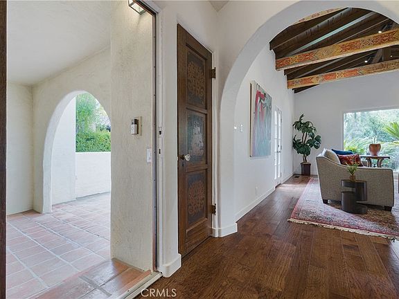 Just two blocks from Warner Avenue Elementary in Little Holmby is this fabulous 2-story courtyard Spanish that has a wonderful traditional floorplan and lots of original vintage details alongside brand new updates throughout. The large welcoming Saltillo-tiled front courtyard is perfect for entertaining al freso style. At the entry, is a large original front door flanked on the inside by two coat closets with super cool original pirate ship detail on the doors. The vaulted wood ceiling in the Living Room is supported by three charmingly stenciled trusses. This grand formal space also features a large picture window, stately fireplace and doors out to both the front and side patios. The formal dining room, also with french doors to the front patio, has space enough for a table set for 10-12. The just-renovated Kitchen with eat-in nook overlooking the Backyard has custom light wood cabinetry, new Thermador refrigerator, microwave and dishwasher suite, a new Viking vent hood over a vintage just-restored Viking 6-burner range with double oven. The adjacent Service Porch has a step-in pantry, plentiful storage around the washer & dryer hook-ups and a door to the backyard. Rounding out the main floor are a cozy Den attached to an updated full Bathroom. The second floor features three Bedrooms including a big Primary Suite that has an extra-deep walk in closet and brand new Primary Bathroom with a dual sink vanity, separate tub and large stall shower. There are two additional Bedrooms, each with spacious storage and that share a Jack and Jill Bathroom with stall shower and new vanity. The roomy backyard presently features a large bricked area that is great for additional off-street parking or that can be turned into a large play or pool area. There is a detached 2-car garage. Additional features include a 3 year old roof, a brand new sewer line from the house to the property line, mostly copper and ABS pipes and central HVAC on the 2nd floor. Near to UCLA, Westwood Village, Westfield Century City and the soon-to-open D Line (Purple Line).