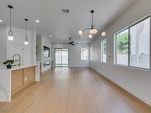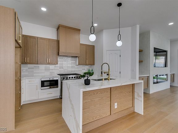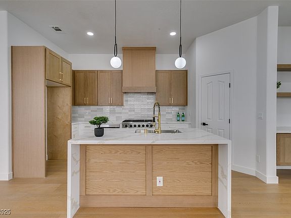 This Beautifully Fully Renovated One-Story Home sits at the end of the cul-de-sac in the heart of Summerlin. This home features an open floor plan, high ceilings, brand new LVP flooring throughout, Freshly painted, new baseboards, Custom Cabinets throughout entire property, Kitchen features beautiful waterfall island 36 inch stainless steel range, built in microwave, and dishwasher as well. Newly tiled backsplash. The inviting family room has a custom built fireplace/TV Media center with TV included! Both bathrooms have been completely redone with lovely oversized walk in shower in the primary. The primary bedroom has a custom built LED fireplace thats perfect for relaxing nights! All bedrooms featuring ceiling fans. The backyard features a covered patio and has recently been upgraded with new synthetic grass and landscape. This house is completely turn key and ready for move in! Low HOA!