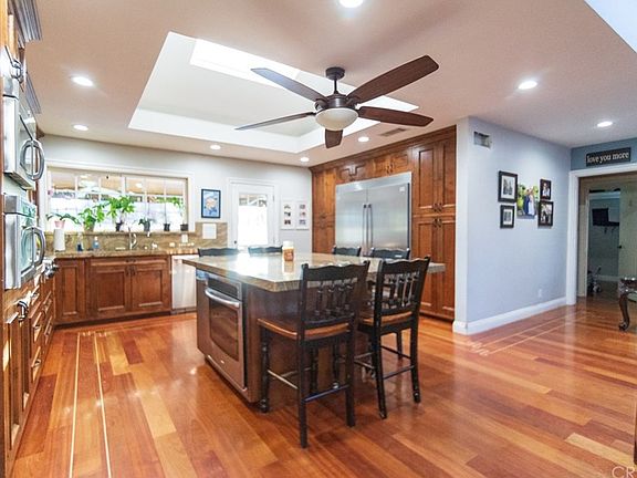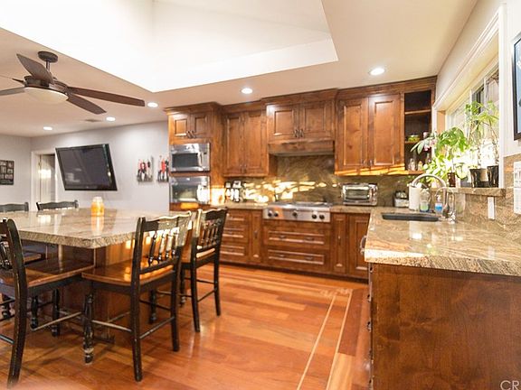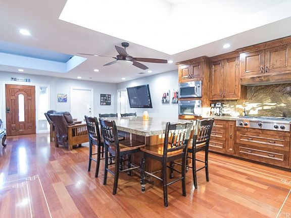 Highly upgraded entertainers home in Granada Hills. This 4+3 includes an amazing kitchen with all custom hand built Knotty Alder cabinets, granite counters with a center island. Frigidaire professional series refrigerator and Chefs range as well as Dual microwaves and lots of storage. The incredible backyard boasts a custom pool, one of a kind tiki waterslide, Gas fire pit, multiple waterfalls, Koi pond, 12X36 Covered patio finished in Bamboo as well as Built in barbeque and a custom mural. Other features include a large master suite with oversized Travertine shower and a rain head, 4 individual shower heads, 2 body jets. Brazilian Cherry custom hardwood flooring throughout with Maple feature strips and French knots. Recessed lighting, 2 open soffit skylights, Slate and stamped concrete 2nd bathroom. 3rd bath is a Jack and Jill between bedrooms 3 and 4. Tank less water heater, Nest thermostat, pull down stairs with lots of attic storage. Front yard has been done in synthetic turf and the driveway is stamped concrete. This is a must see home and is fantastic for those pool parties!